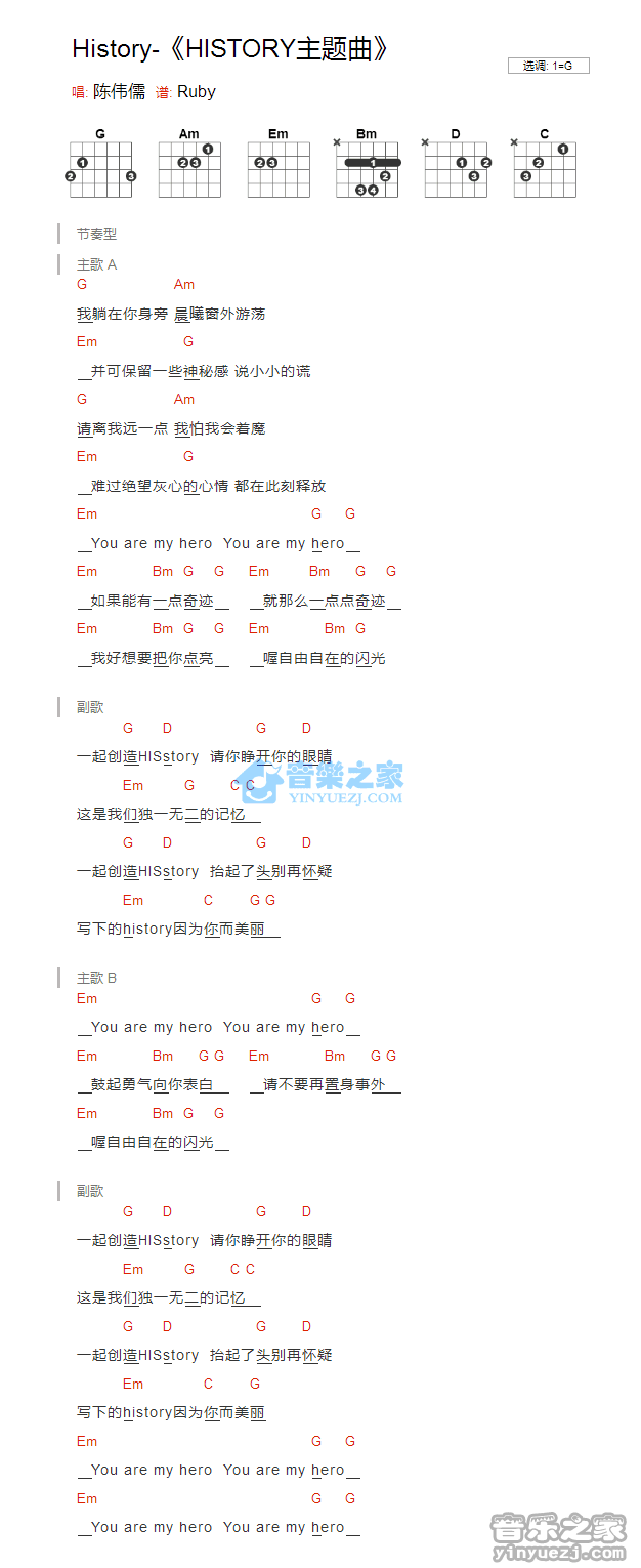 G调版陈伟儒《History》吉他和弦弹唱谱...