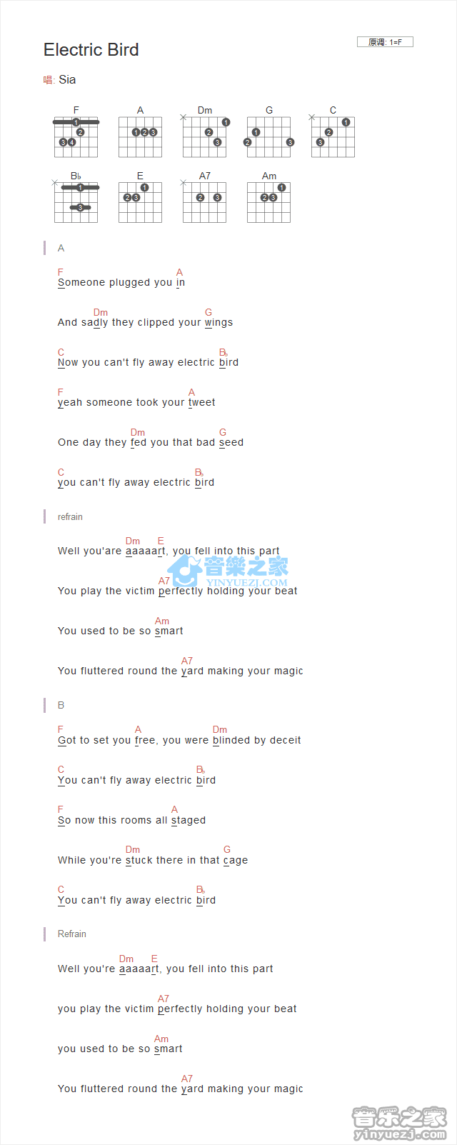 F调版Sia《ElectticBird》吉他和弦弹唱谱...