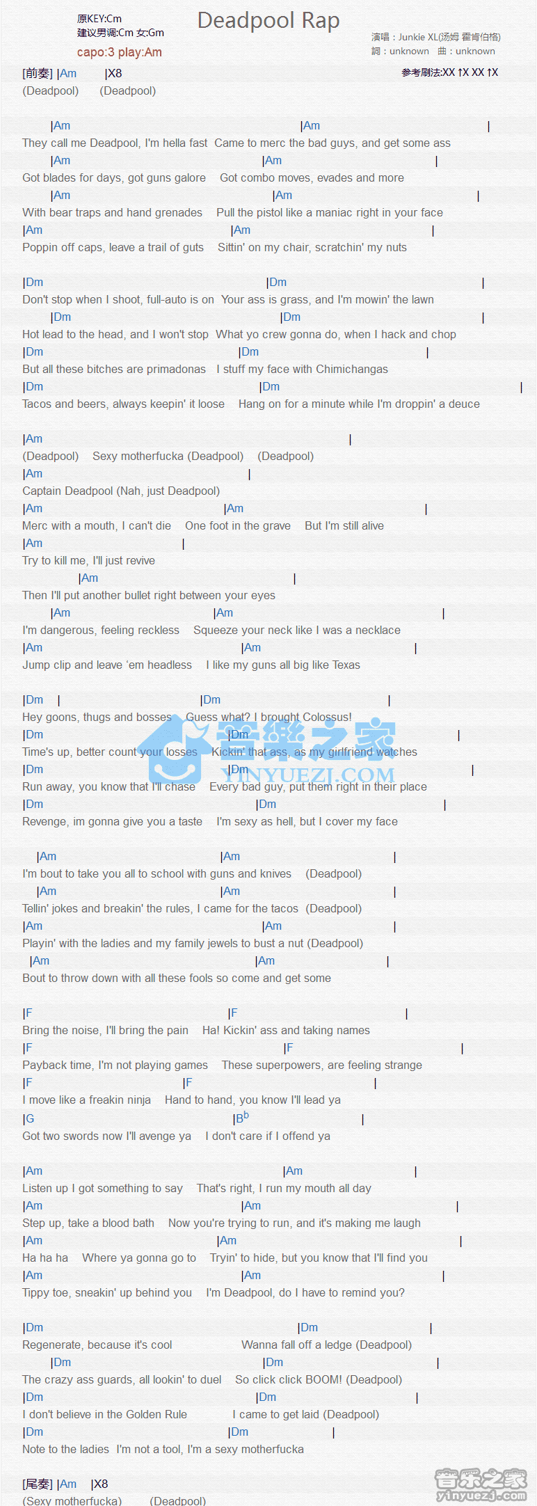 Am调版JunkieXL《DeadpoolRap》吉他和弦弹唱谱...