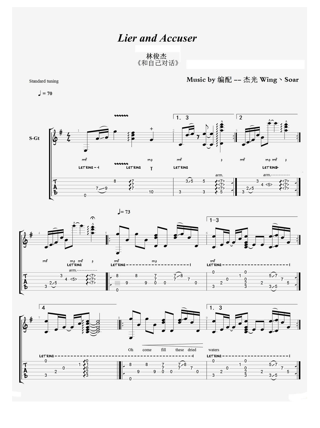 林俊杰LierandAccuser吉他谱,原调F,选调G,降全音调弦。这首歌曲收录在林俊杰的新专辑《和自己对话》中,这首歌低缓的音乐营造出静谧的夜,给人一种有圣经吟诵式的感觉,就好像坐在村庄充满星辰的夜空下的稻田里,弹着吉他,众蛐蛐在做和音,亮点在吉他的变奏,从青春到容颜老去,伤...