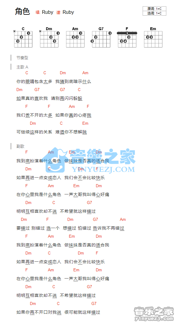 C调版Ruby《角色》吉他和弦弹唱谱...