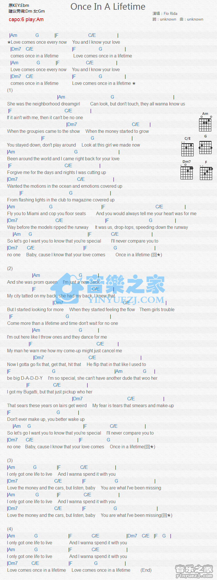 Am调版《OnceInaLifetime》吉他和弦弹唱谱...