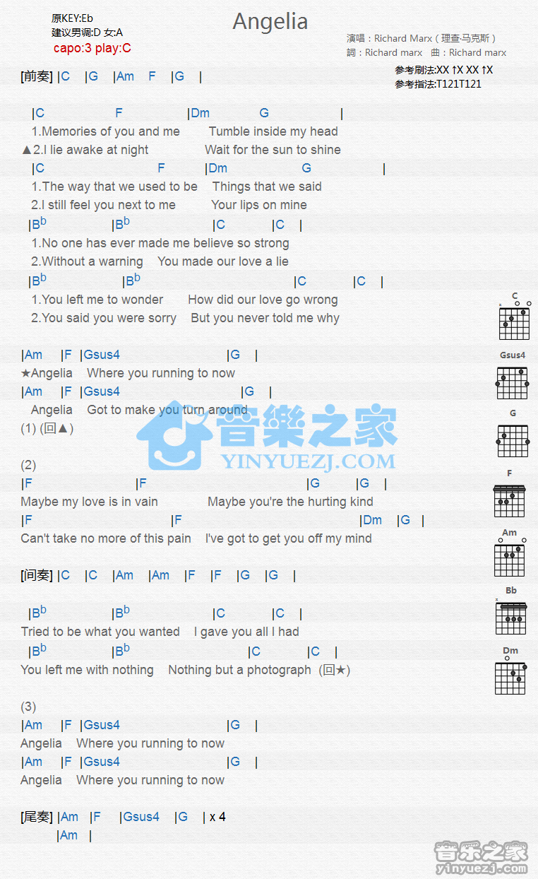 C调版RichardMarx《Angelia》吉他和弦弹唱谱...