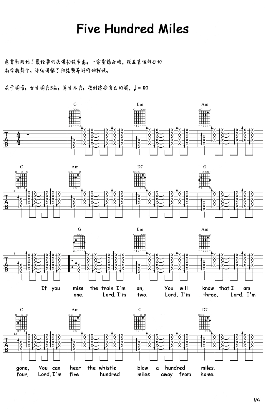 FiveHundredMiles吉他谱,六线谱编配,完整版图片谱,500miles吉他谱,这首歌曲用到了经典的民谣扫弦节奏。一定要练会哦。关于调音,男生调不夹,女生调夹五品,琴友们找到适合自己的调。随谱附上呆萌妹子老师的FiveHundredMiles吉他弹唱教学,视频详细讲了扫...