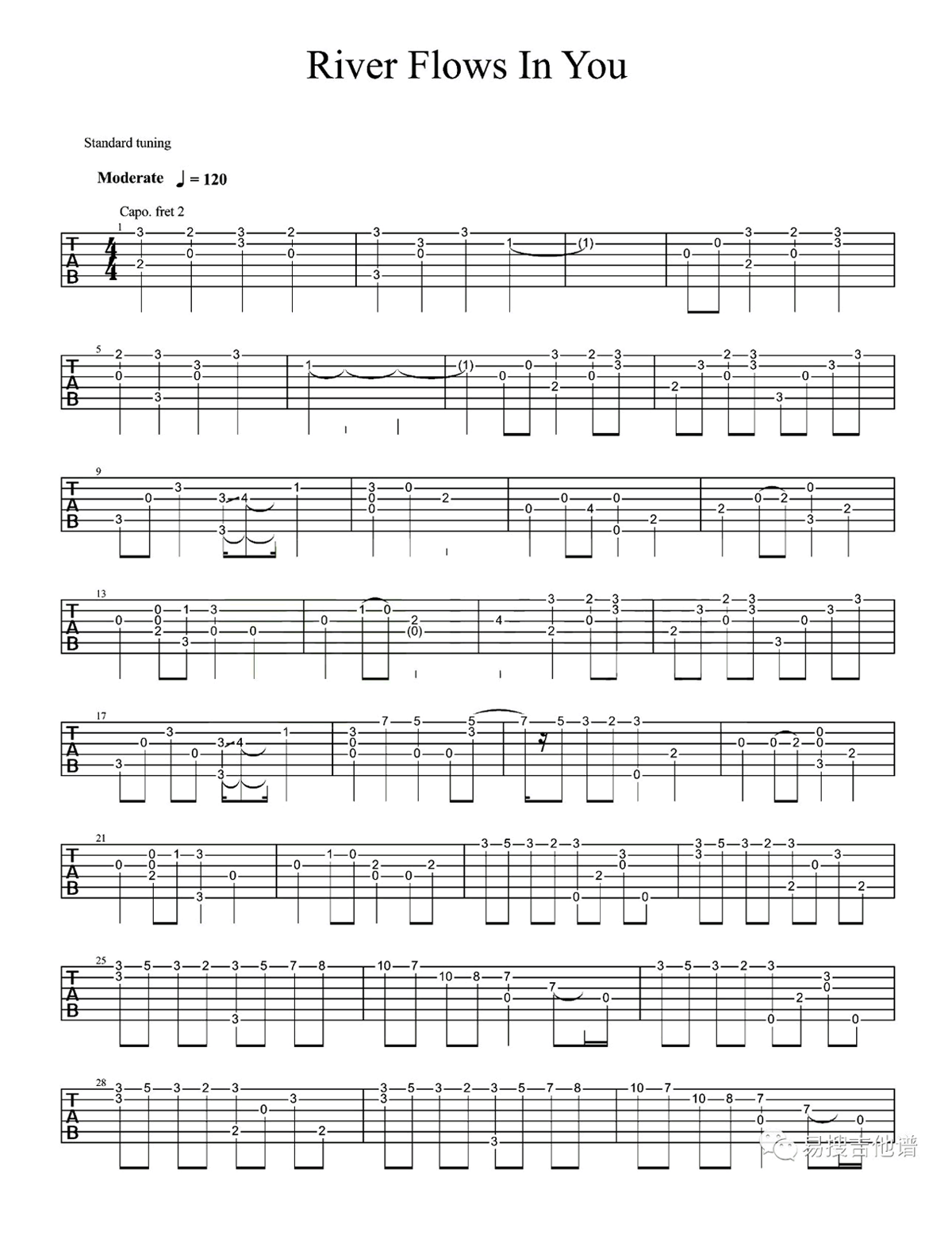 RiverFlowsInYou指弹谱,郑成河演奏,RiverFlowsInYou吉他独奏谱,标准调弦:EBGDAE,一首旋律优美的疗伤治愈音乐,《RiverFlowsInYou》(中文名:你的心河)曲作者和演奏者是韩国钢琴家李闰珉,选自李闰珉2002年7月的专辑《初恋》(Firs...