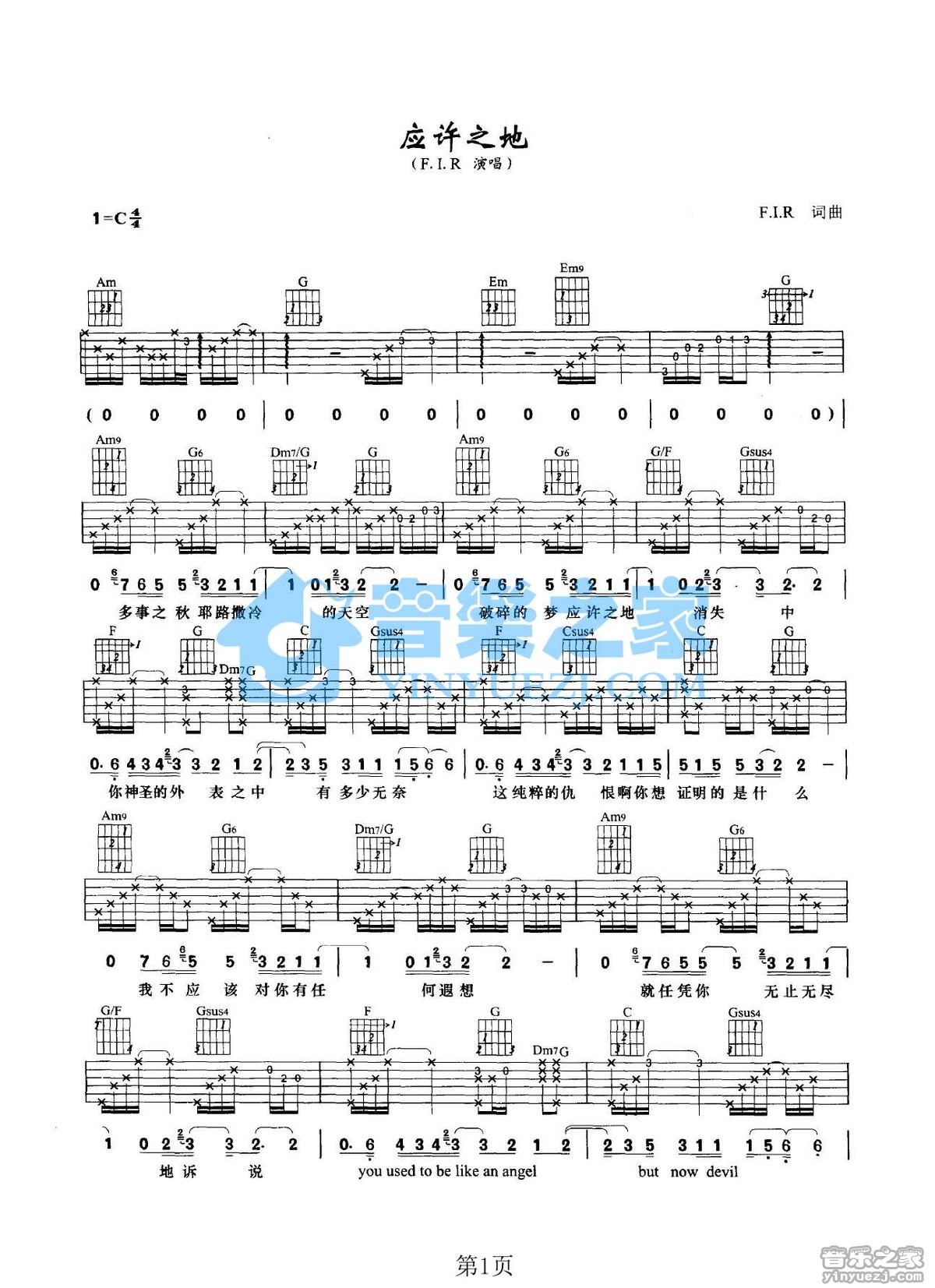 C调版F.I.R《应许之地》吉他弹唱六线谱...