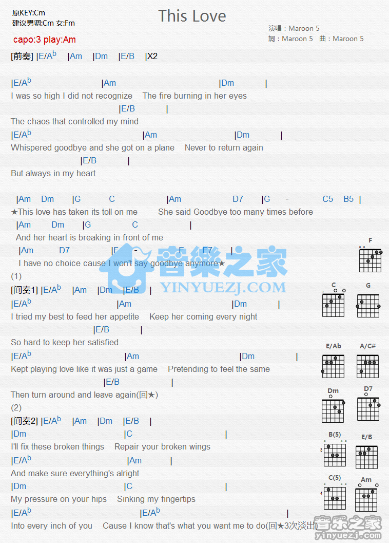 Am调版Maroon5《ThisLove》吉他和弦弹唱谱...