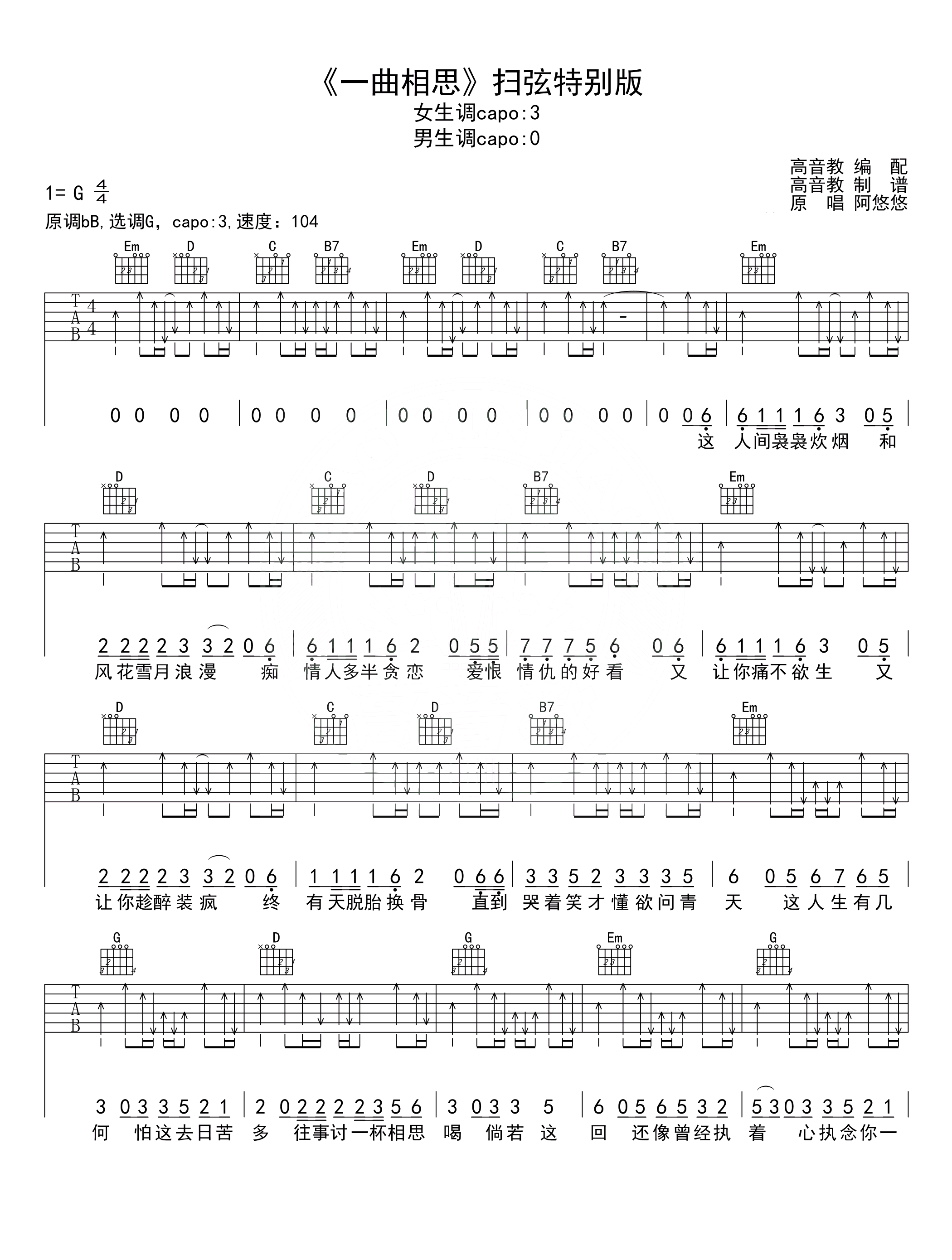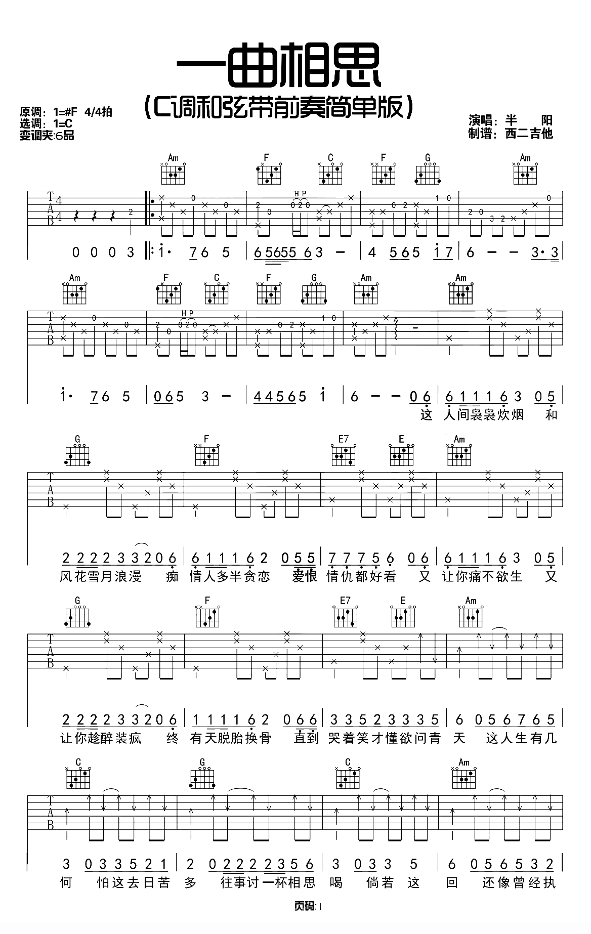 一曲相思吉他谱,半阳/阿悠悠演唱,一曲相思六线谱,原调bB,选调G,扫弦版编配,女生调Capo夹三品,男生调不用夹,这人间袅袅炊烟,和风花雪月浪漫。痴情人多半贪恋,爱恨情仇的好看。阿悠悠小姐姐在同学的婚礼上唱歌助兴,一首《一曲相思》惊艳全场,引抖音网络平台翻唱热潮。...