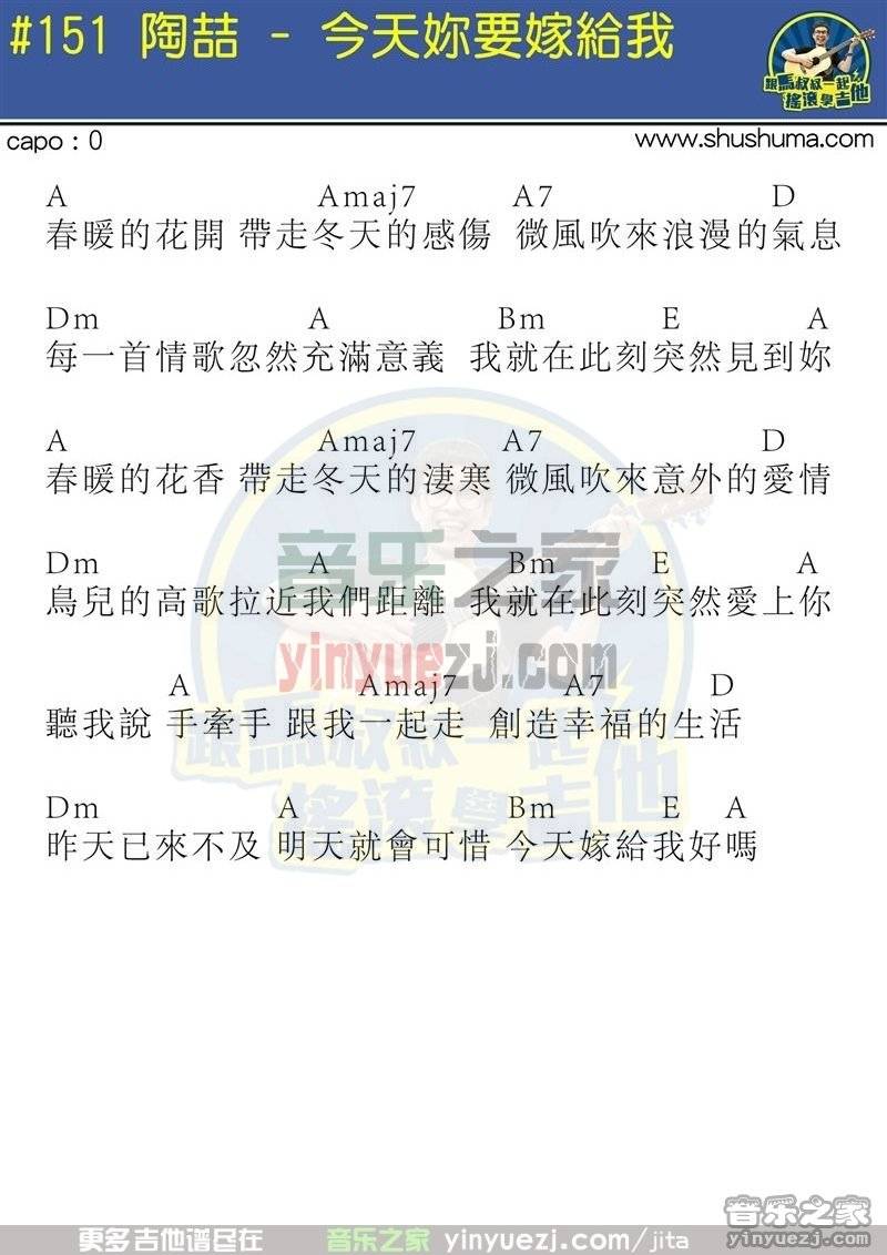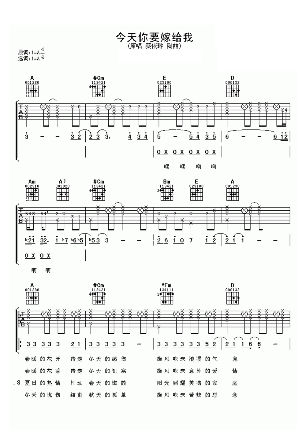 ,选用A调,您可以方便参考本页图片和弦示意图和扫弦指法进行吉他弹奏。今天你要嫁给我吉他谱 陶醇枨...