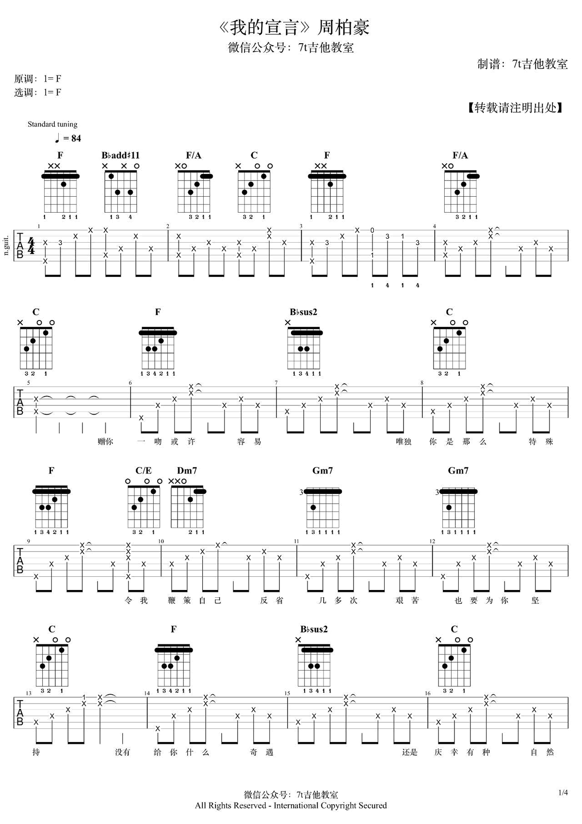 周柏豪《我的宣言》吉他谱,7T吉他教室编配出品,共有4张高清图谱。...