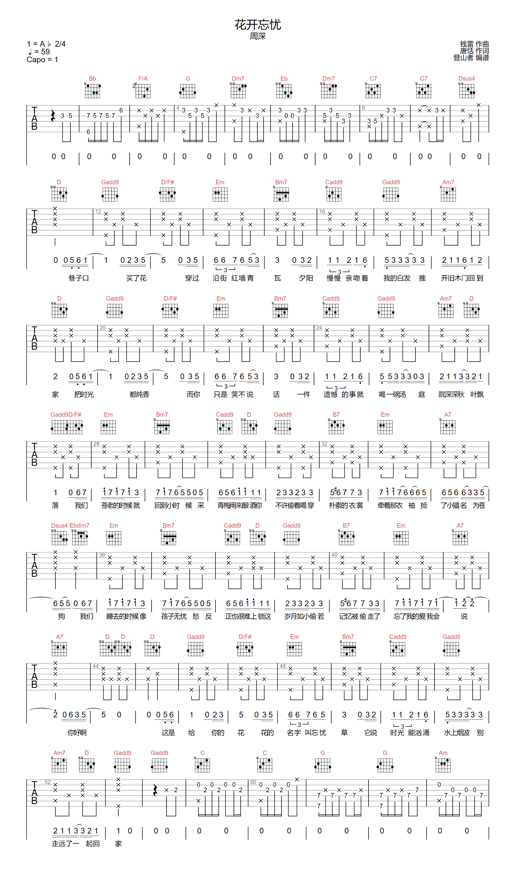 《花开忘忧》吉他谱,周深演唱,随谱附上吉他弹唱演示视频,花开忘忧吉他弹唱谱,原调bA调,曲谱选用G调指法编配,变调夹1品回到原调音高,共两张图片六线谱,喵了个艺制谱分享,曲谱宝上传。 周深在春晚的舞台上,唱起了《花开忘忧》,仿佛彼岸花绽放了一片温暖,为我们带来了遗忘烦恼...