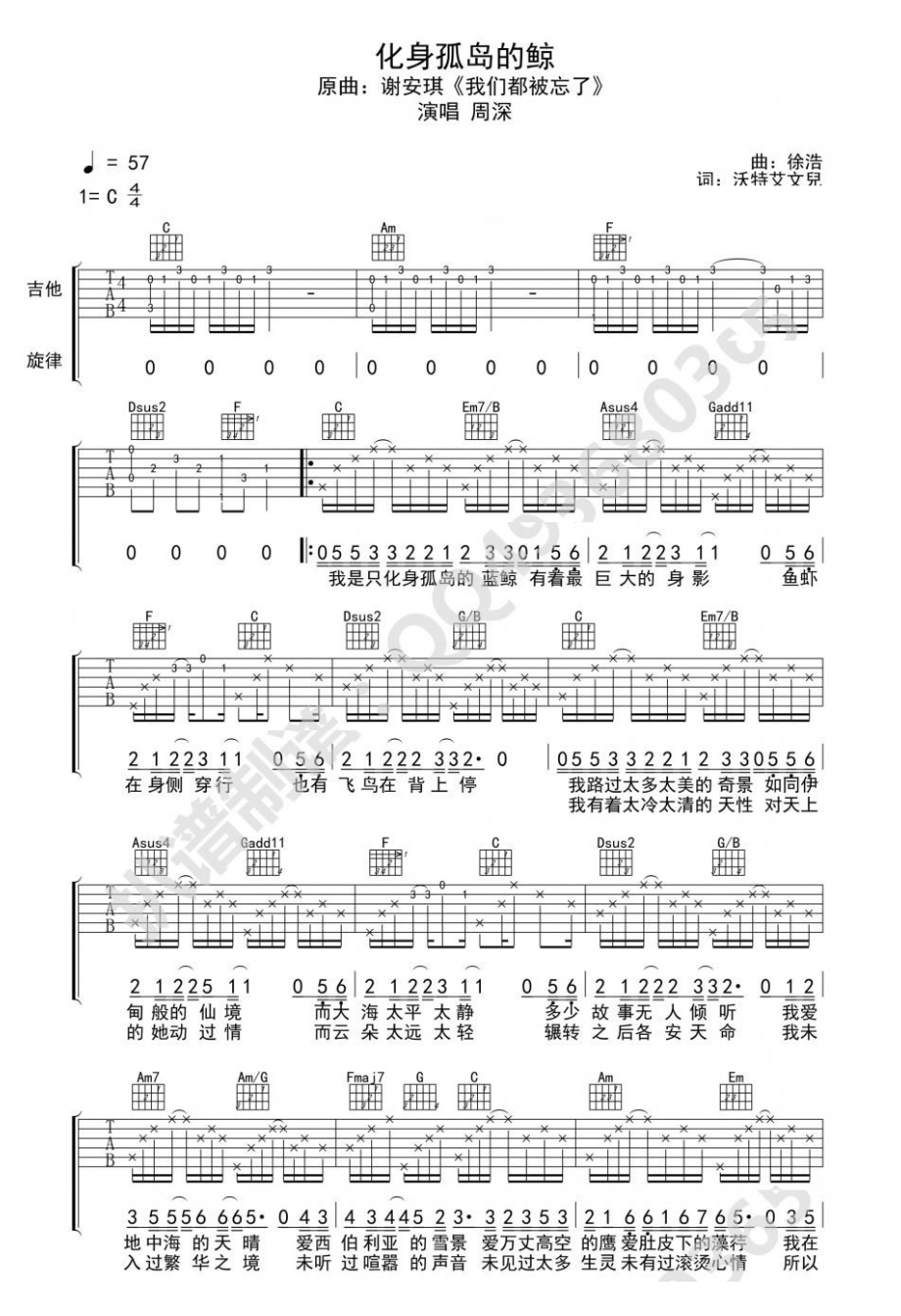 吉他周深《化身孤岛的鲸》吉他谱 - 好听到爆炸
