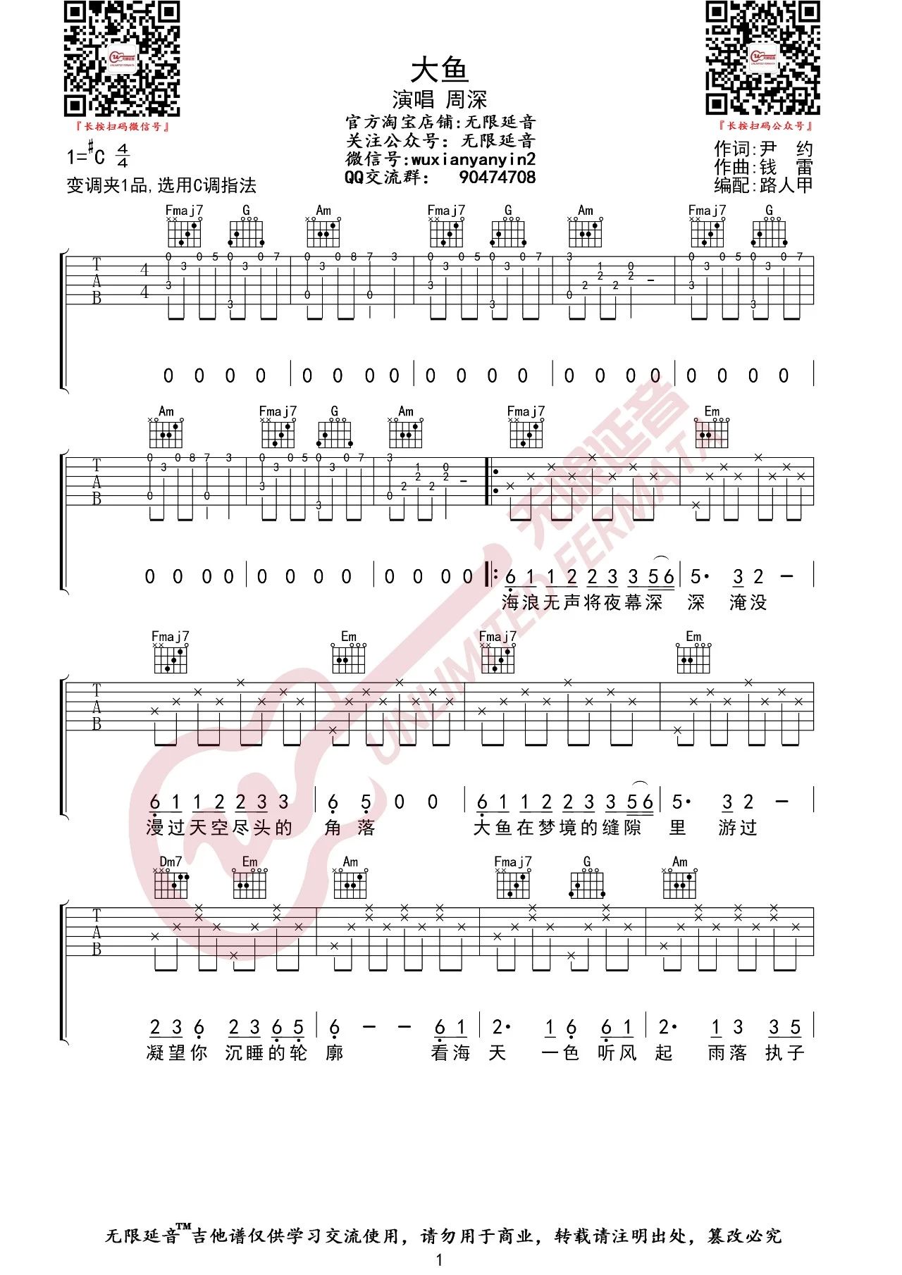 “怕你飞远去,怕你离我而去,更怕你,永远停留在这里。每一滴泪水,都向你流淌去,倒流回,最初的相遇……”周深《大鱼》,天籁美声纯粹的一尘不染,清丽婉转间带着几分中国传统文化中的古典哀愁,空灵而沉醉,让人久久回味。C调指法六线谱,演奏难度中等,有几个和弦不常用也比较难按,好在右手指法...