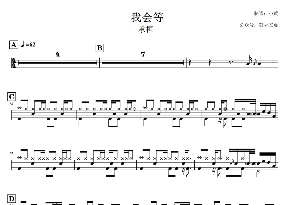 承桓《我会等》架子鼓谱,小黄编配出品,共有1张高清图谱,免翻页排版设计。...