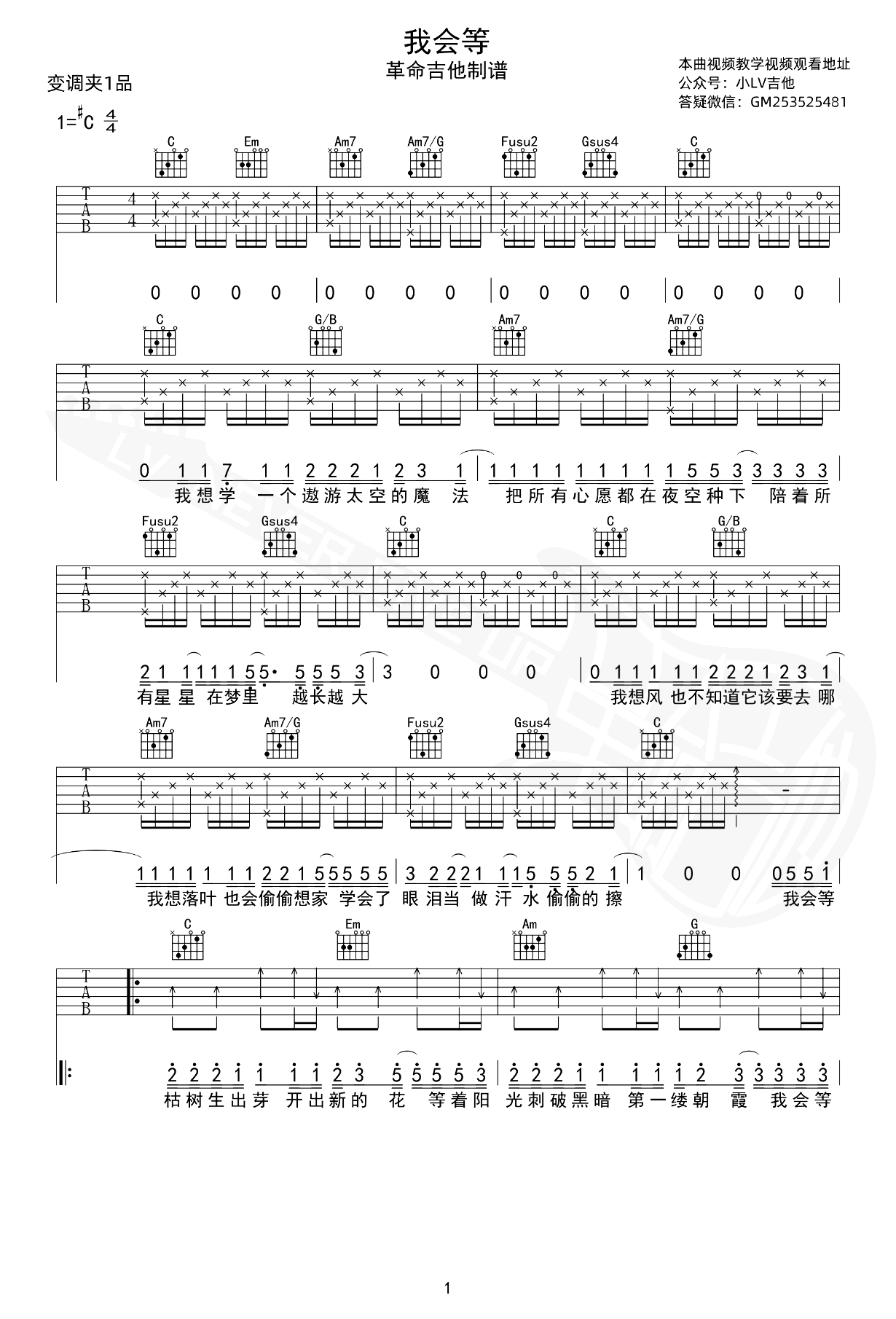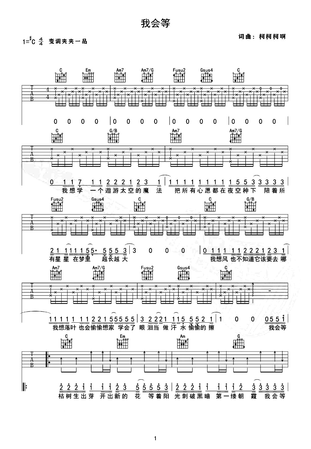我会等吉他谱,承恒演唱的一首网络热门歌曲,我会等待时光的流转,会等待每一个日出和夜晚,让岁月变得温柔。 《我会等》吉他弹唱谱,选用C调和弦指法,变调夹夹一品为原调升C音高,完整编配共三张图片六线谱,感谢革命吉他出品分享,曲谱宝上传更新。 我知道等待并不容易,但...