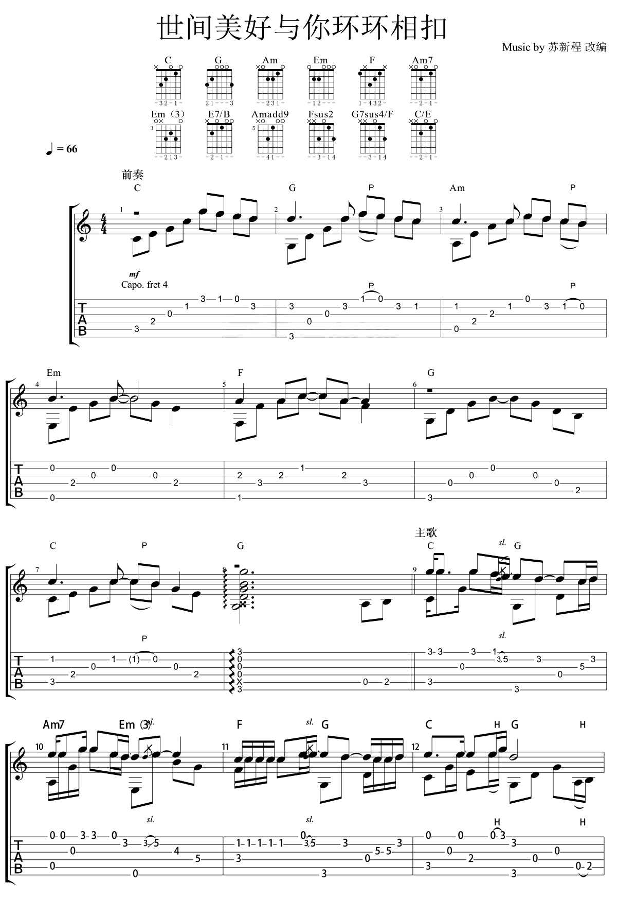 吉他柏松《世间美好与你环环相扣》吉他谱 - 完整版