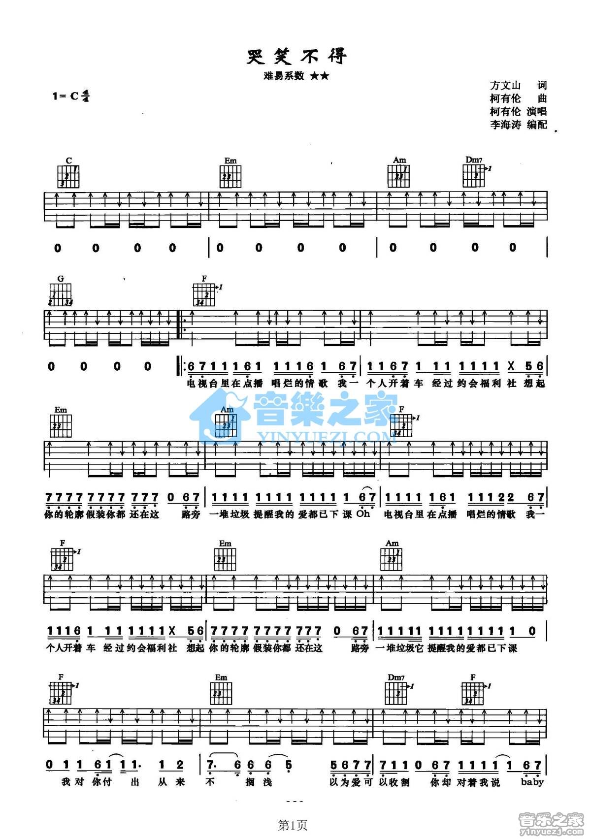 C调版柯有伦《哭笑不得》吉他弹唱六线谱...