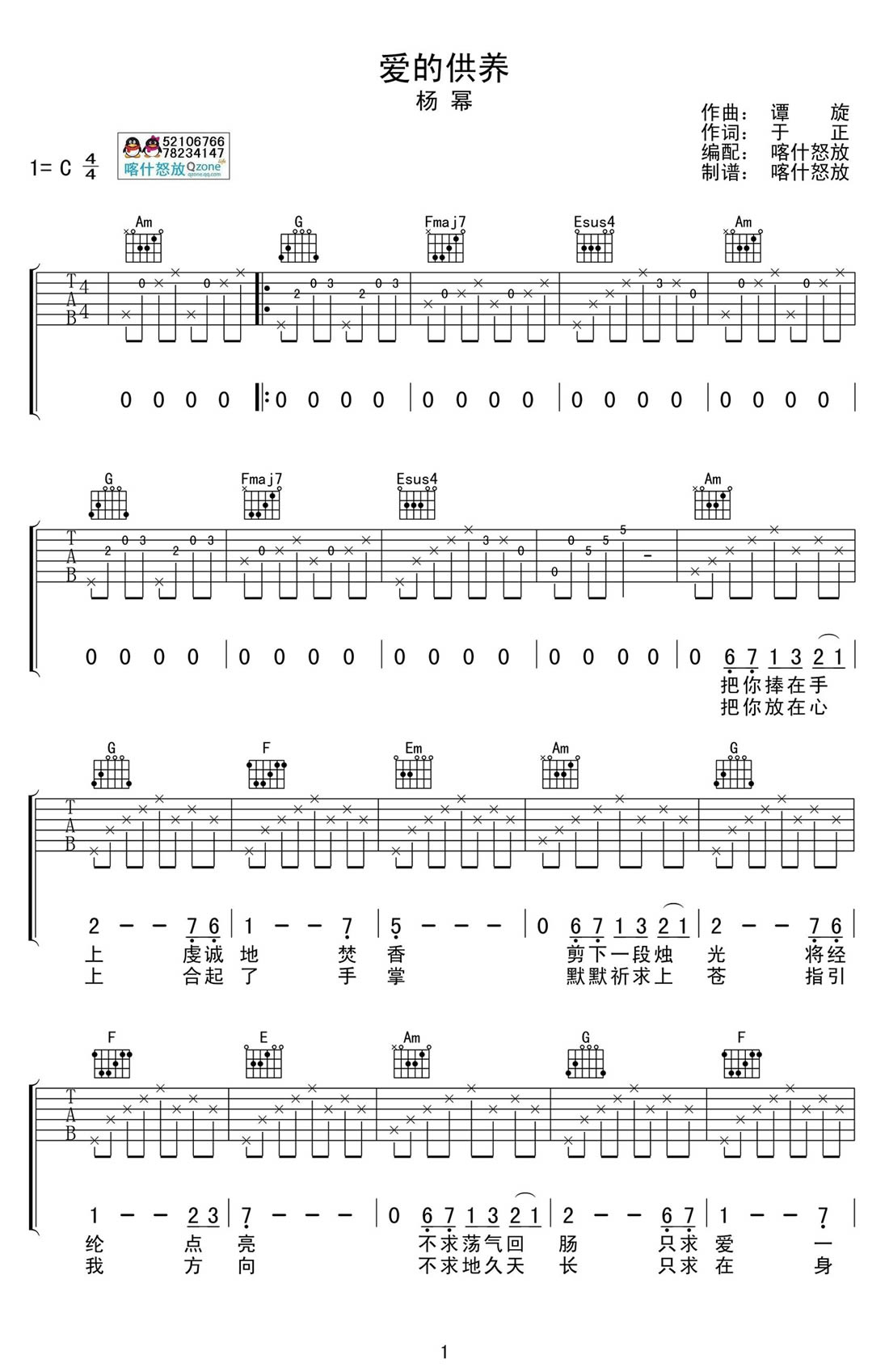 杨幂《爱的供养》吉他谱,沁阳华艺琴行编配出品,共有2张高清图谱,免翻页排版设计。...