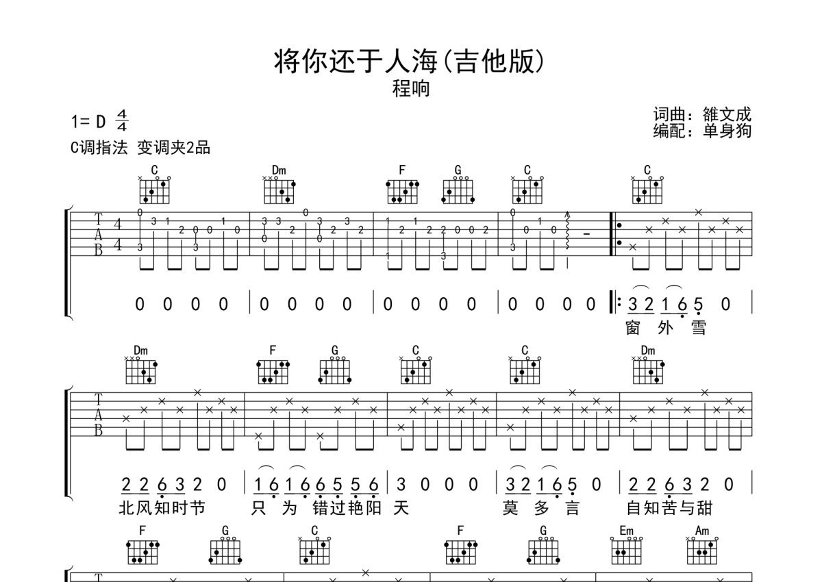 程响《将你还于人海》吉他谱,采用C调指法编配,单身狗编配出品,共有1张高清图谱,免翻页排版设计。...