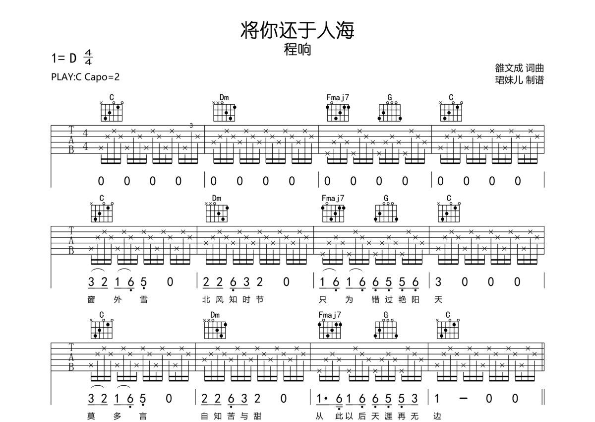程响《将你还于人海》吉他谱,采用C调指法编配,珺妹儿编配出品,共有1张高清图谱,免翻页排版设计。...