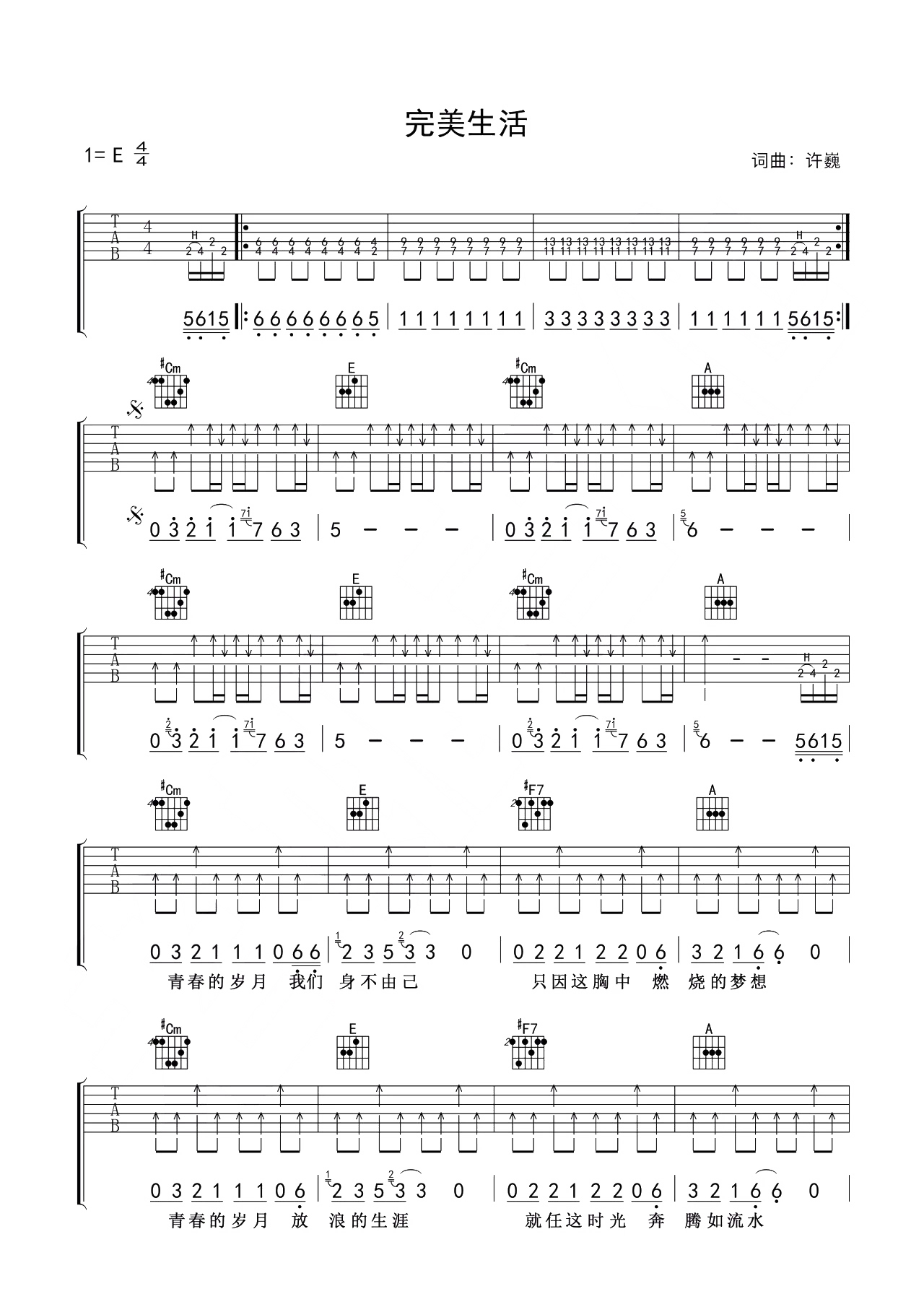 许巍完美生活吉他谱,原曲为E调,变调夹夹第四品。这歌词,这旋律,每次听都有共鸣,喜欢这纯净的歌,像一段过往的时光,像一位老友,充满淡淡的回忆;而又充满对未来的向往,向往这《完美生活》。...