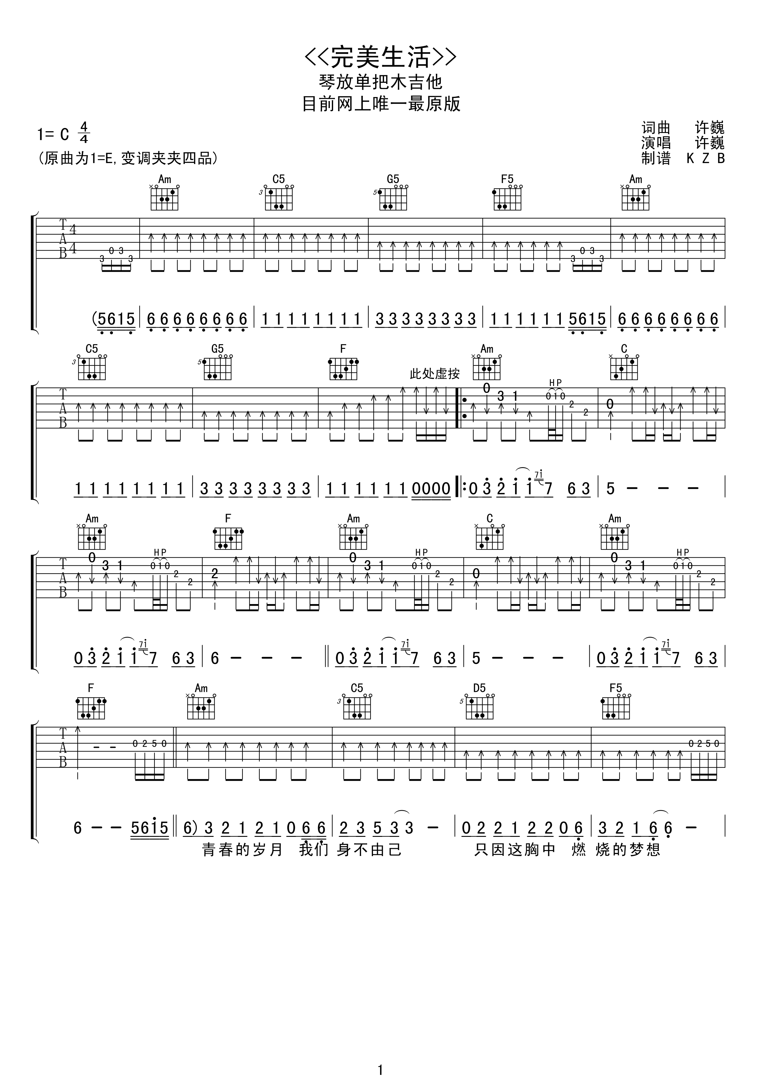 吉他许巍《完美生活》吉他谱 - 完整版