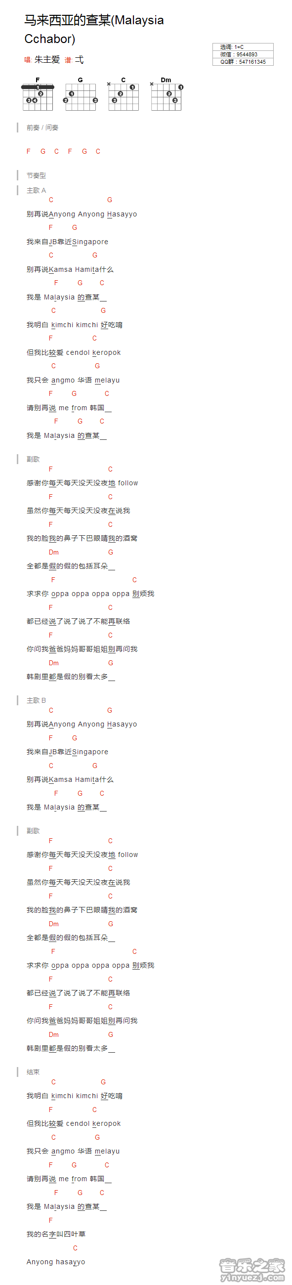 吉他朱主爱《马来西亚的查某》吉他谱 - 很多人都在弹的版本