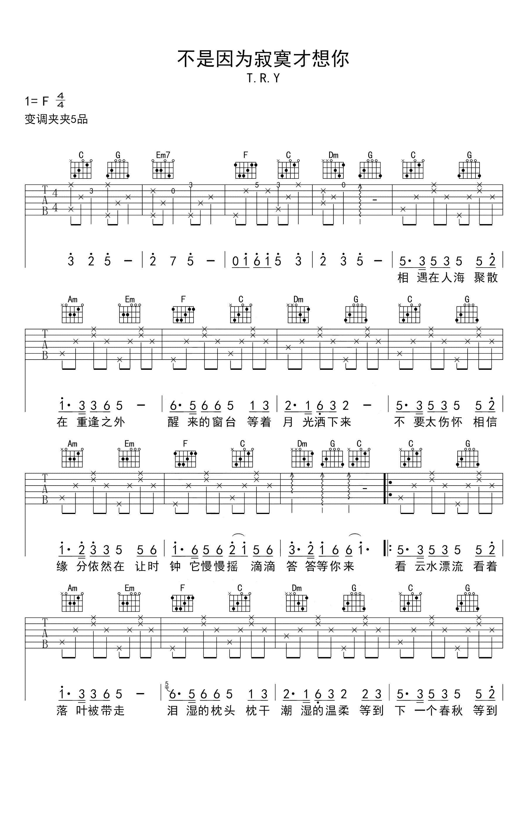 《不是因为寂寞才想你》吉他谱,TRY陶钰玉演唱,继《最近》之后,又一首被王小帅翻唱二再度翻红的老歌。不是因为寂寞才想你六线谱,高清弹唱图片谱,原调F,变调夹夹五品,选用C调指法。老师编配说明:这首歌原调是F转升F,原版在最后反复副歌时升了半个调,我省略掉了升调的部分还有副歌反复部...