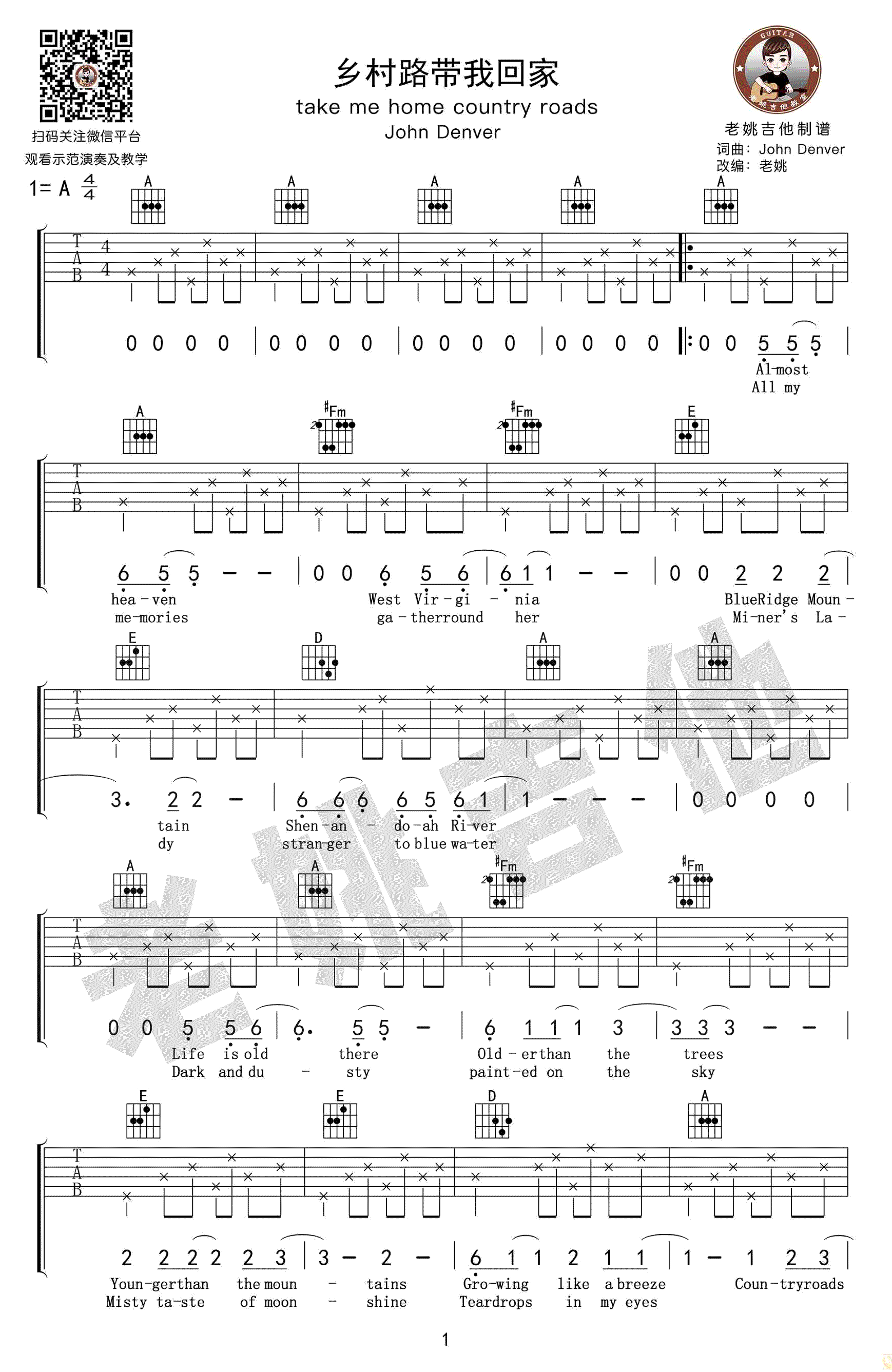 Takemehomecountryroads吉他谱,约翰丹佛演唱的一首经典英文歌曲,乡村路带我回家吉他谱,A调指法编配,随谱附上配套吉他弹唱教学视频。JohnDenver创作并演唱的著名乡村歌曲,听不厌的旋律,吉他的伴奏每个音符都刚刚好。故乡是每个人对内心的渴望与寄托,回家的路显...